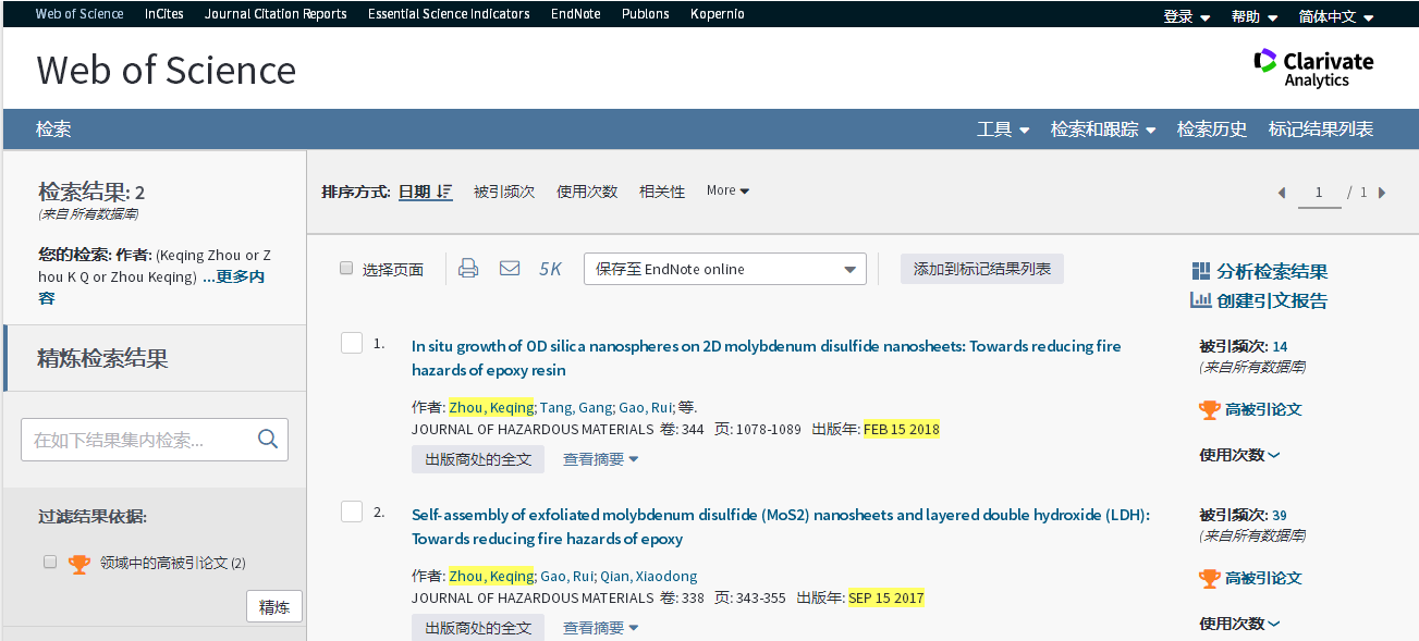 基本科学指标数据库(Essential Science Indicators,简称ESI)最新数据显示,安全工程系周克清老师发表的论文“In situ growth of 0D silica nanospheres on 2D molybdenum disulfide nanosheets: Towards reducing fire hazards of epoxy resin”入选高被引论文。该论文是周克清老师以beat365 手机版官方网站(武汉)beat365 手机版官方网站为第一单位、第一作者和通讯作者身份发表的第2篇ESI高被引论文。2018年7月周克清老师发表的论文“Self-assembly of exfoliated molybdenum disulfide (MoS2) nanosheets and layered double hydroxide (LDH): Towards reducing fire hazards of epoxy”曾同时入选ESI高被引论文和热点论文。