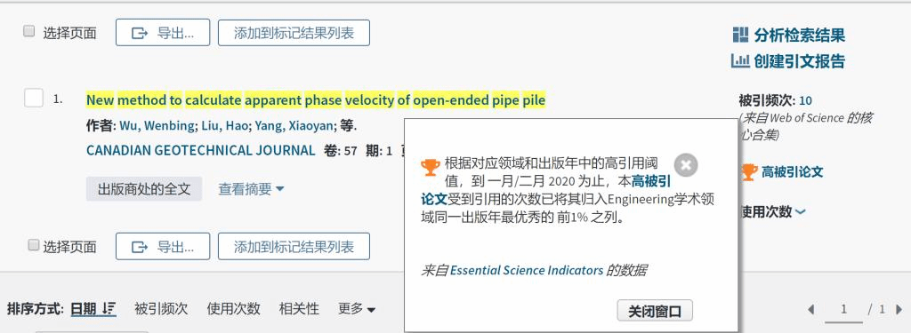 (通讯员:吴文兵、黄静)根据2020年5月基本科学指标数据库(Essential Science Indicators,简称ESI)最新数据显示,beat365官网勘察与基础工程系吴文兵教授团队2020年在国际土木工程领域顶级期刊《Canadian Geotechnical Journal》 上发表的学术论文“New method to calculate apparent phase velocity of open-ended pipe pile” 入选ESI高被引论文(Highly Cited Paper)。