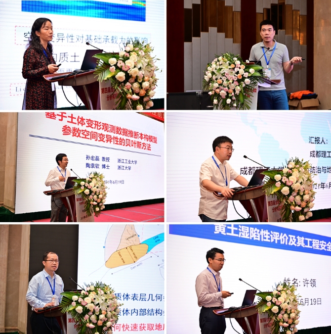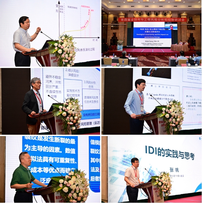 会议期间,各位专家学者以目前各自所属的专业方向及具体研究成果为主要内容,为线下线上参会人员作了精彩的学术报告。beat365 手机版官方网站(武汉)唐辉明教授以《基于演化的滑坡防控理论与方法技术》为题作会议特邀报告,美国克莱姆森大学C. Hsein Juang教授在线上作《地质/地层/岩土模型不确定性的量化及影响评价》的特邀报告,同济大学黄宏伟教授以《工程风险管控存在的问题与适应性风险管理》为题作特邀报告,武汉大学李典庆教授以《Copula理论在岩土工程不确定性与可靠性分析中应用进展》为题作特邀报告,重庆大学周小平教授以《场富集有限元法及其应用》为题作特邀报告,中国大地保险张帆总经理应邀以《IDI的实践与思考》为题作特邀报告。