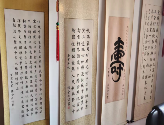 两位老教授在教学科研岗位上兢兢业业,为教育事业挥洒了汗水,奉献了青春和力量。退休后他们继续关心学校和学院发展,积极建言献策。两位教授生活情趣高雅,杨金丹教授爱好作诗习字绘画,刘兴敏教授热爱舞蹈、唱歌、乒乓球和太极拳。大家欣赏了杨金丹教授的爱国书画作品,深受教育和感染。大家对他们在悠长岁月里敬业爱岗、默默奉献深表敬意,感谢他们为学校和学院发展做出的贡献,纷纷表示要学习他们的优良品质,传承育人初心,努力工作,跑好属于我们这一代人的接力棒。最后大家和两位老教授拍摄了合照,留下一份珍贵的记忆。