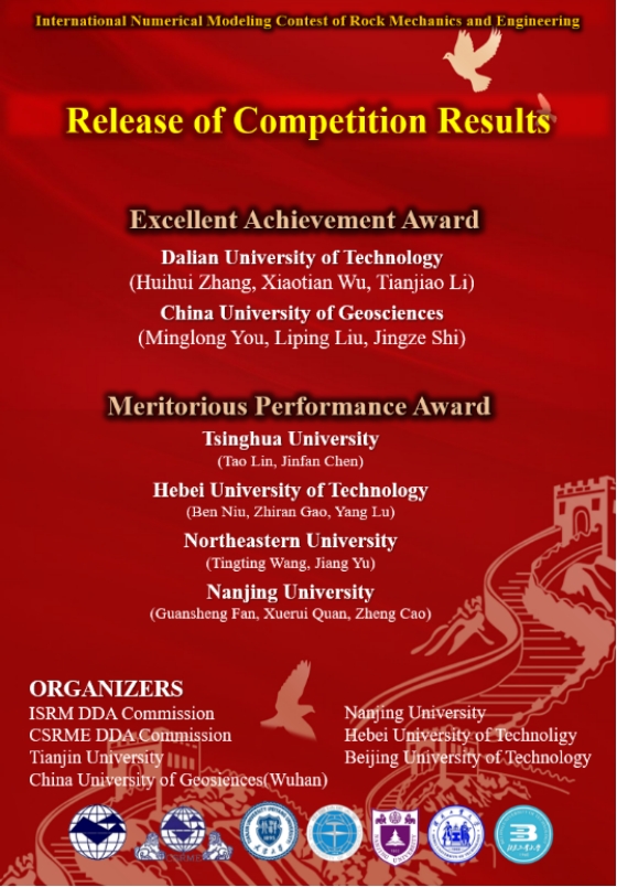 本次大赛由国际岩石力学与岩石工程学会非连续变形分析专委会(ISRM DDA)联合中国岩石力学与工程学会岩土体非连续变形分析专委会(CSRME DDA)及beat365 手机版官方网站(武汉)、天津大学、南京大学、北京工业大学、河北工业大学等多所高校联合举办,于2021年第十一届亚洲岩石力学大会(ARMS11)期间同步举行。大赛鼓励研究生对岩石力学问题的现有数值方法和软件进行公开、透明和广泛的验证,为共享岩石力学问题的实验和数值结果提供平台。