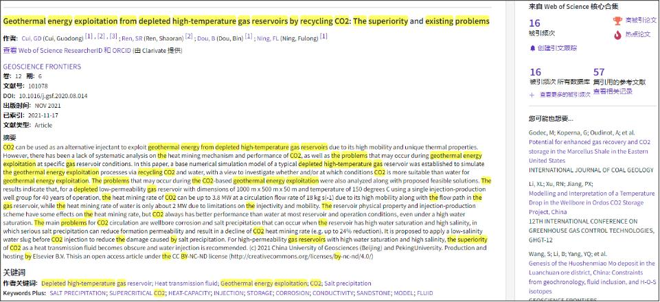 (通讯员:黄静)根据2022年3月基本科学指标数据库(Essential Science Indicators,简称ESI)最新数据显示,beat365官网崔国栋副教授于2021年在国际地学期刊Geoscience Frontiers上发表的学术论文“Geothermal energy exploitation from depleted high-temperature gas reservoirs by recycling CO₂: The superiority and existing problems”入选ESI热点和高被引论文(Hot and Highly Cited Paper)。该论文第一作者兼通讯作者为崔国栋副教授,beat365 手机版官方网站(武汉)beat365 手机版官方网站为第一署名单位。