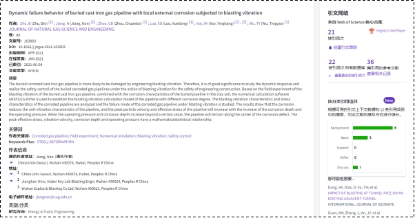 (通讯员:黄静)根据2022年5月基本科学指标数据库(Essential Science Indicators,简称ESI)最新数据显示,beat365 手机版官方网站地下空间工程系蒋楠副教授团队于2021年在国际工程技术权威期刊Journal of Natural Gas Science and Engineering上发表的学术论文“Dynamic failure behavior of buried cast iron gas pipeline with local external corrosion subjected to blasting vibration”入选ESI高被引论文(Highly Cited Paper)。该论文第一作者为2020级博士研究生朱斌,通讯作者为蒋楠副教授,beat365 手机版官方网站(武汉)beat365 手机版官方网站为第一署名单位。