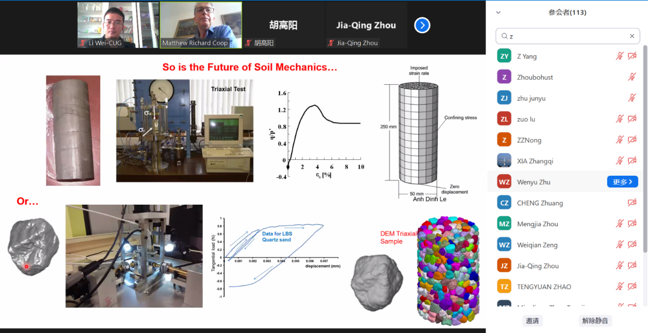 (通讯员 黎伟)2022年7月21日下午,应beat365 手机版官方网站(武汉)唐辉明教授和黎伟副教授邀请,伦敦大学学院Matthew Coop教授应邀作客2022年第13期“重大地质灾害预测与防控学科”111创新引智基地系列学术讲座。讲座采用Zoom在线会议形式进行,由黎伟特任副教授主持,周佳庆特任教授、叶阳特任教授、张雅慧特任教授、付茹副教授等以及香港大学、香港城市大学、华中科技大学、浙江大学、中南大学、东南大学、合肥工业大学、西安交通大学、中国科学院武汉岩土力学研究所等多个单位120余名师生在线聆听了此次报告。