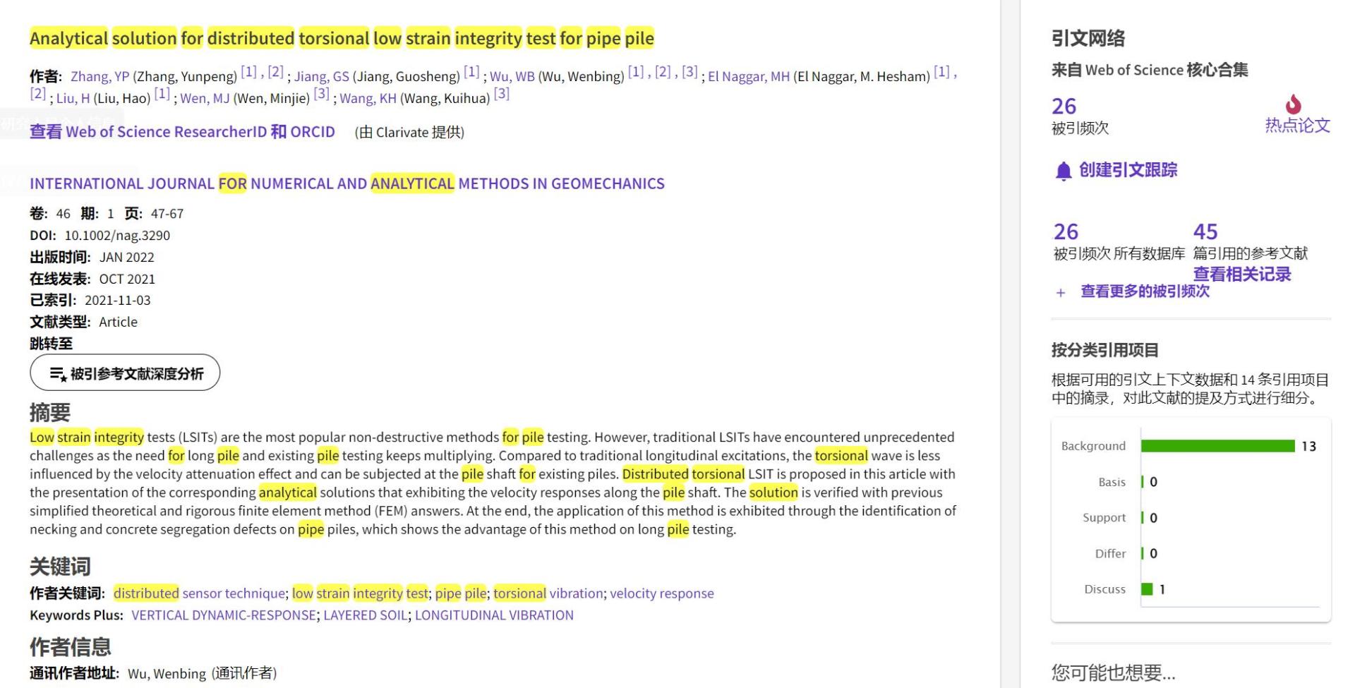 (通讯员 黄静)根据2022年9月基本科学指标数据库(Essential Science Indicators,简称ESI)最新数据显示,beat365 手机版官方网站勘察与基础工程系吴文兵教授团队于2021年在国际岩土工程数值计算权威期刊International Journal for Numerical and Analytical Methods in Geomechanics上发表的学术论文“Analytical solution for distributed torsional low strain integrity test for pipe pile”入选ESI热点论文(Hot Paper)。该论文第一作者为2020级博士研究生张云鹏,通讯作者为吴文兵教授,beat365 手机版官方网站(武汉)beat365 手机版官方网站为第一署名单位。
