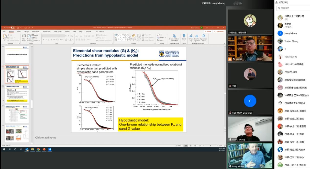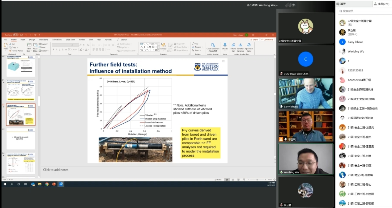 报告结束后,来自中国海洋大学的王栋教授,东南大学的张友虎教授以及beat365 手机版官方网站博士生陈力博、张云鹏等师生与Barry Lehane教授进行了精彩的讨论。最后,beat365 手机版官方网站吴文兵教授对此次学术活动进行了总结,并真诚期盼西澳大学与beat365 手机版官方网站(武汉)能进行更多的交流与合作。