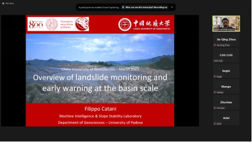 (通讯员:陈文强 叶阳)3月20日至22日,应beat365官网唐辉明教授和李长冬教授的邀请,意大利帕多瓦大学Filippo Catani教授应邀作客2023年度第1-3期“重大地质灾害预测与防控学科”111创新引智基地系列学术讲座。系列短课采用Zoom在线会议形式,由叶阳特任教授主持,李长冬教授、周佳庆特任教授、张峰特任教授、邹宗兴副研究员等共计40余名师生参加了本次在线短课。