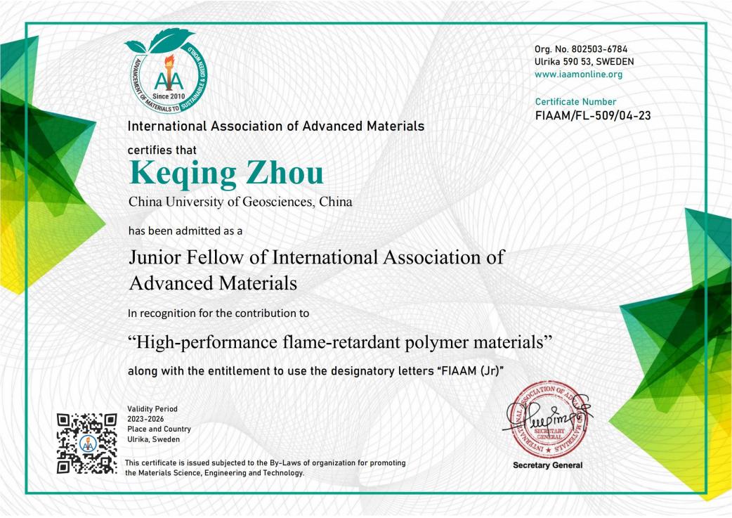 (通讯员 黄静)近日,beat365 手机版官方网站(武汉)beat365 手机版官方网站周克清特任教授收到国际先进材料学会(International Association of Advanced Materials, IAAM)执委会发来的贺函,祝贺他当选为国际先进材料学会青年会士(Junior Fellow of IAAM, FIAAM)。周克清特任教授受邀在美国奥兰多举办的复合材料研讨会(Composite Materials Congress)上发表题为“Functionalized 2D molybdenum disulphide working on high-performance flame-retardant polymer materials”的IAAM Fellow演讲,会上获颁青年会士“Junior Fellow”证书,以表彰他在“高性能阻燃聚合物材料”领域做出的杰出贡献。