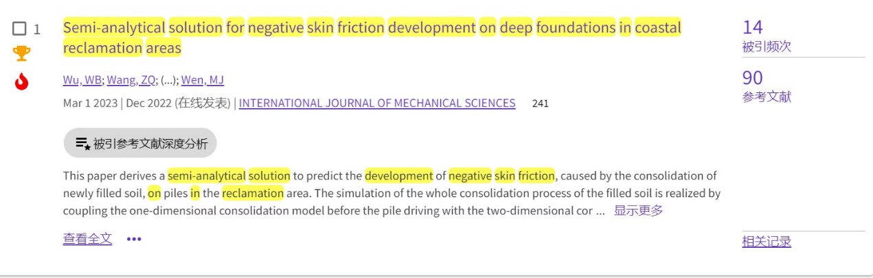 (通讯员 黄静)根据2023年7月基本科学指标数据库(Essential Science Indicators,简称ESI)最新数据显示,beat365 手机版官方网站勘察与基础工程系吴文兵教授团队于2023年在国际工程力学领域权威期刊International Journal of Mechanical Sciences(IF: 7.3, 中科院一区TOP)上发表的学术论文“Semi-analytical solution for negative skin friction development on deep foundations in coastal reclamation areas”同时入选ESI热点论文和高被引论文。该论文第一作者为吴文兵教授,第二作者为勘察与基础工程系王宗琴硕士,beat365 手机版官方网站(武汉)beat365 手机版官方网站为第一署名单位。