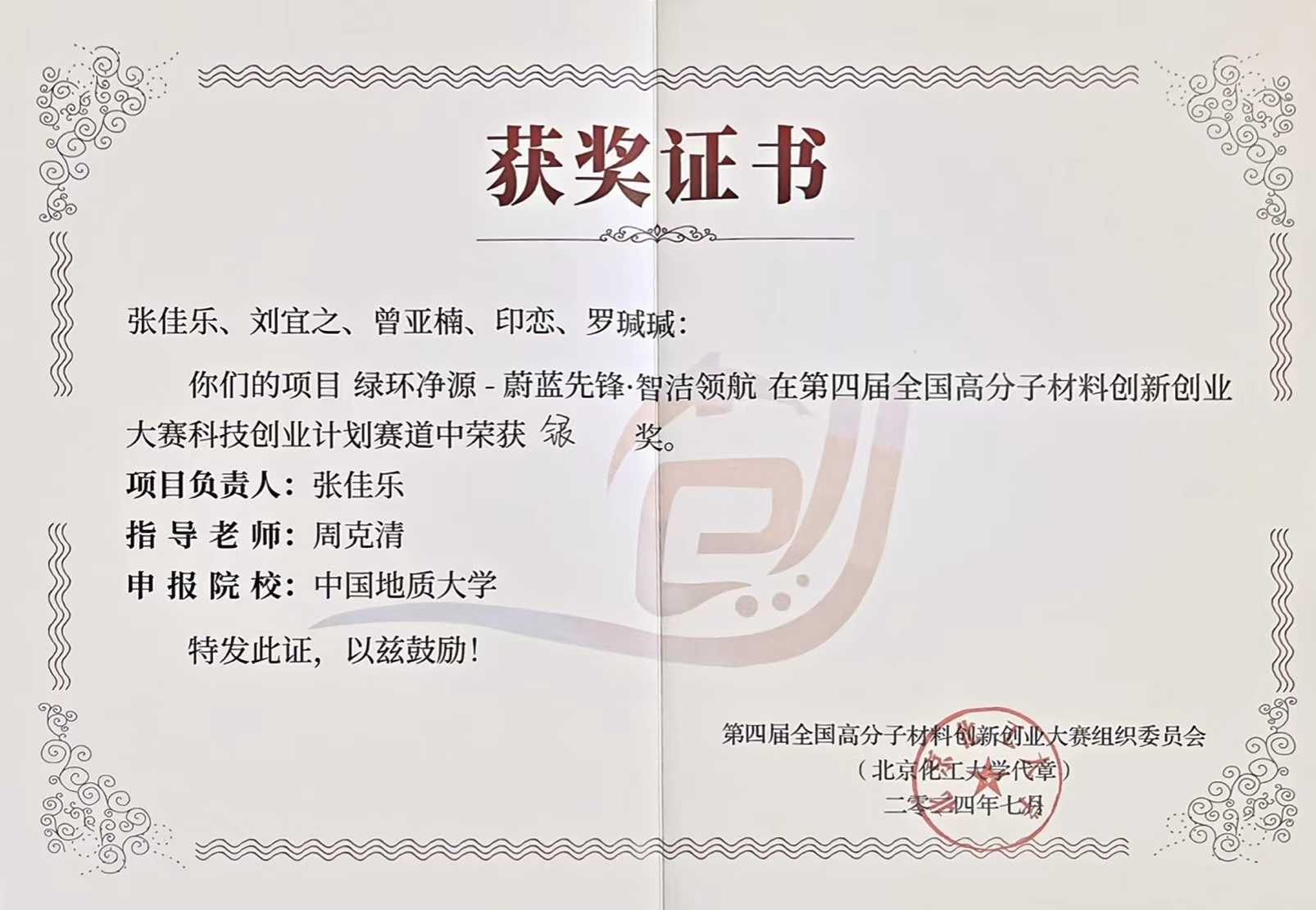 周克清特任教授指导的《绿环净源-蔚蓝先锋·智洁领航》项目荣获第四届全国高分子材料创新创业大赛科技创业计划赛道银奖。项目团队成员包括beat365 手机版官方网站安全工程系本科生张佳乐、刘宜之、博士研究生生印恋、罗瑊瑊和马克思主义学院本科生曾亚楠。