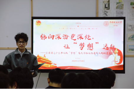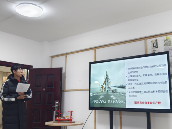 主题团日第一项,由054231班团支部代表王一琛同学领学习近平总书记致“梦想”号大洋钻探船建成入列的贺信精神。他通过图片、视频、数表等方式全方位多角度展示了我国自主设计建造的首艘大洋钻探船“梦想”号的强大性能和独特优势。他自豪地谈到,“梦想”号钻采系统国际领先,最大钻深可达11000米,具备4种钻探模式和3种取心方式,有望助力全球科学家实现“打穿地壳、进入地球深部”的科学梦想,为我国深海资源勘探、关键技术装备研发以及全球科学家开展大洋科学钻探研究提供重大平台支撑。