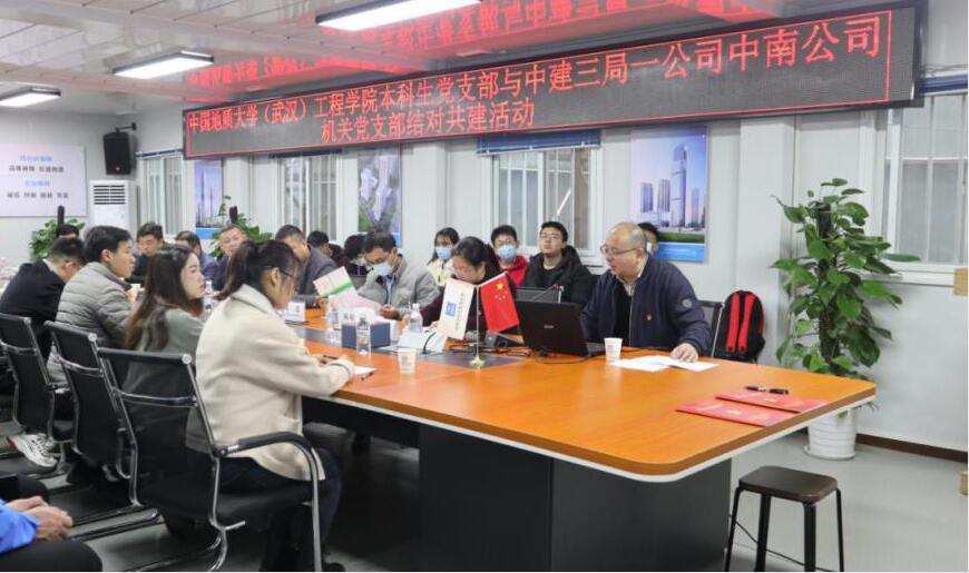 (通讯员:陈启维 李振华)为进一步探索校企合作人才培养模式,引导学生前置行业认知,中建三局一公司中南公司机关党支部与beat365 手机版官方网站(武汉)beat365 手机版官方网站道桥与建筑专业本科生党支部于2020年11月22日在光谷中心项目总部开展了“党建引领·校企共建”结对共建活动。中建三局一公司人力资源部副经理李骄健,中建三局一公司中南公司副总经理、超高层管理中心负责人梁劲松,副总经理王雅林,机关党支部书记陈婷华,beat365 手机版官方网站(武汉)beat365 手机版官方网站党委副书记江广长,学生办公室主任文新,辅导员王俊、李振华以及双方的党员代表参加本次活动。